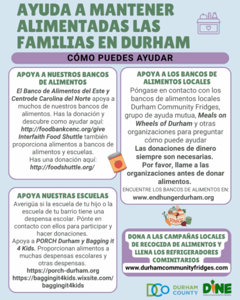 El gobierno del condado de Durham ha creado un folleto informativo sobre recursos alimentarios (adjunto en PDF y PNG) con enlaces a programas de seguridad alimentaria en todo el condado. Incluye un código QR que dirige a la nueva página web de recursos alimentarios comunitarios del condado de Durham, donde se enumeran numerosos recursos.
