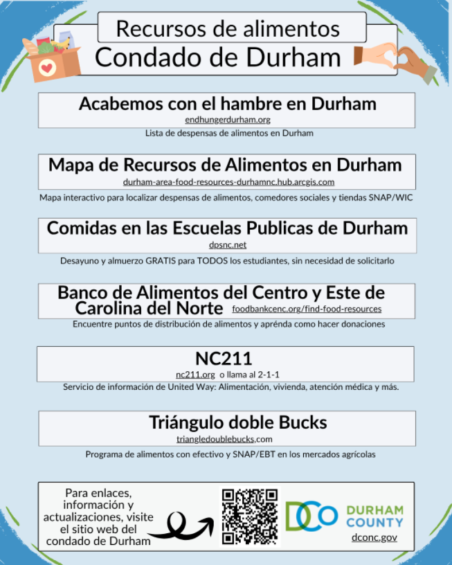 El gobierno del condado de Durham ha creado un folleto informativo sobre recursos alimentarios (adjunto en PDF y PNG) con enlaces a programas de seguridad alimentaria en todo el condado. Incluye un código QR que dirige a la nueva página web de recursos alimentarios comunitarios del condado de Durham, donde se enumeran numerosos recursos.