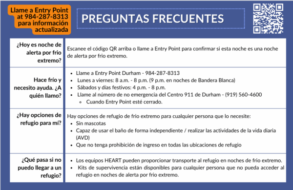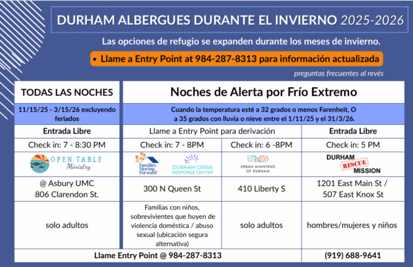 Independientemente del estado de Bandera Blanca, por favor derive a cualquier miembro de la comunidad de Durham que busque refugio a Entry Point Durham al 984-287-8313 para información sobre recursos y disponibilidad de albergue.