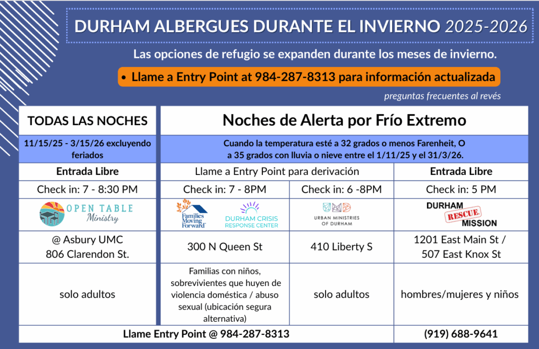 Independientemente del estado de Bandera Blanca, por favor derive a cualquier miembro de la comunidad de Durham que busque refugio a Entry Point Durham al 984-287-8313 para información sobre recursos y disponibilidad de albergue.