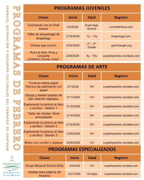 “Febrero es un excelente momento para que nuestra comunidad pruebe algo nuevo y se mantenga activa durante los meses de invierno”, dijo Tracy Burnett, Directora de Parques, Recreación y Recursos Culturales del Condado de Chatham. “Estamos entusiasmados de ofrecer programas que fomentan la creatividad, el aprendizaje y la conexión para participantes de todas las edades, ya sea que nos acompañen por primera vez o regresen a una clase favorita”.